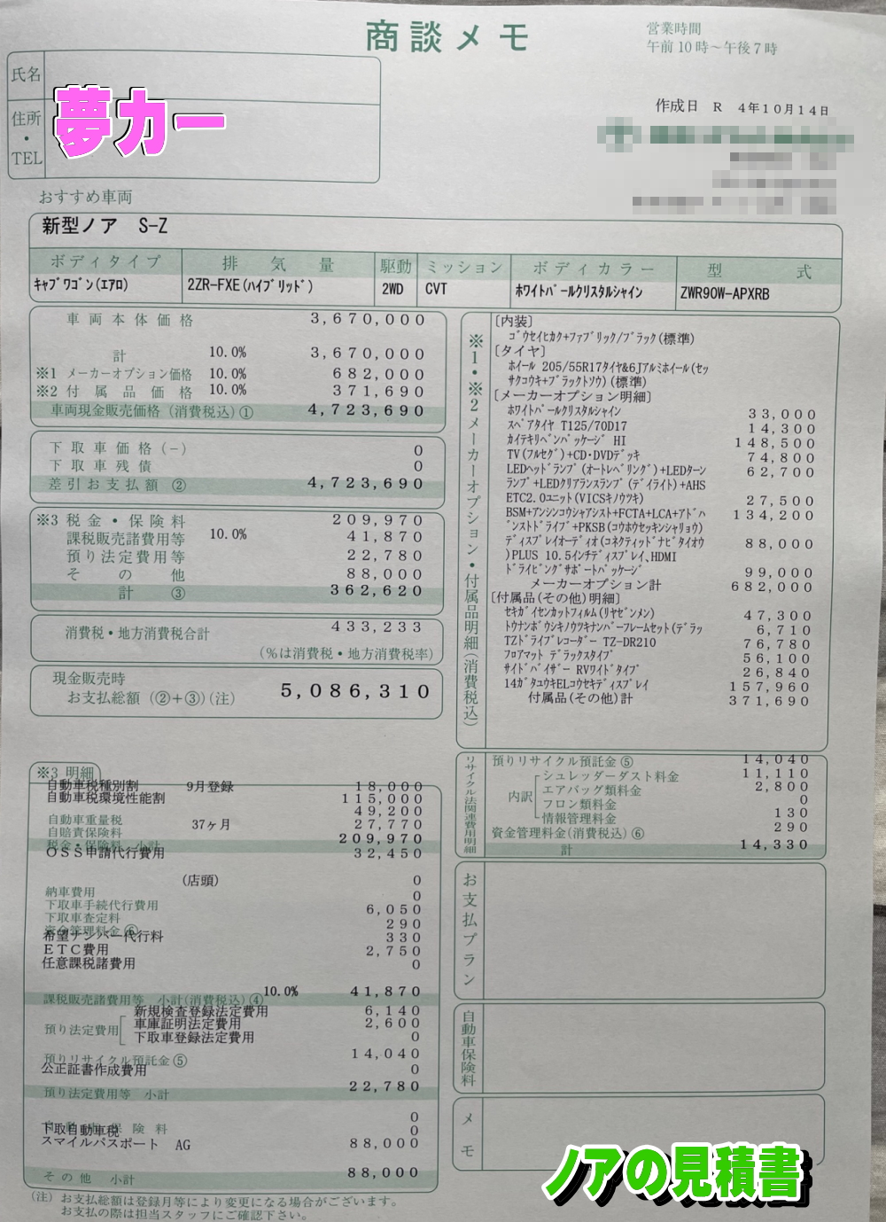 ノアハイブリッド S-Zの支払総額(新車乗り出し価格)は、5,086,310円となりました。