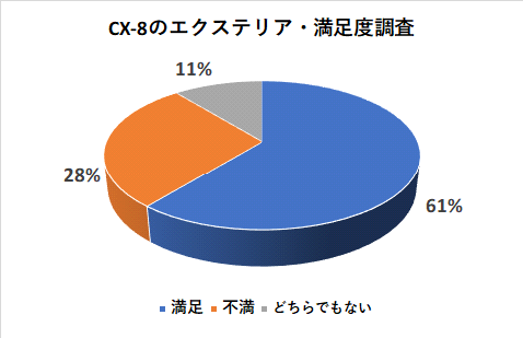 CX-8のエクステリアに関するユーザーの口コミをまとめたところ、落ち着いた大人の高級感が人気を博し、高い満足度につながっている傾向が見えてきます。