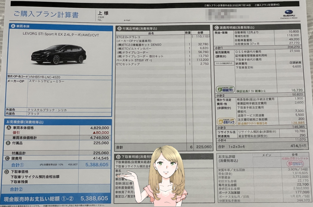 合格ラインの値引きを引き出せれば、総額514万円の乗り出しで、レヴォーグ STIスポーツR EXを購入する事が出来ます!