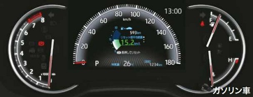 ガソリン車ではタコメーター (エンジン回転計) がある箇所に、ハイブリッドはドライバーにエコ運転を促すハイブリッドシステムインジケーターが配置されています。